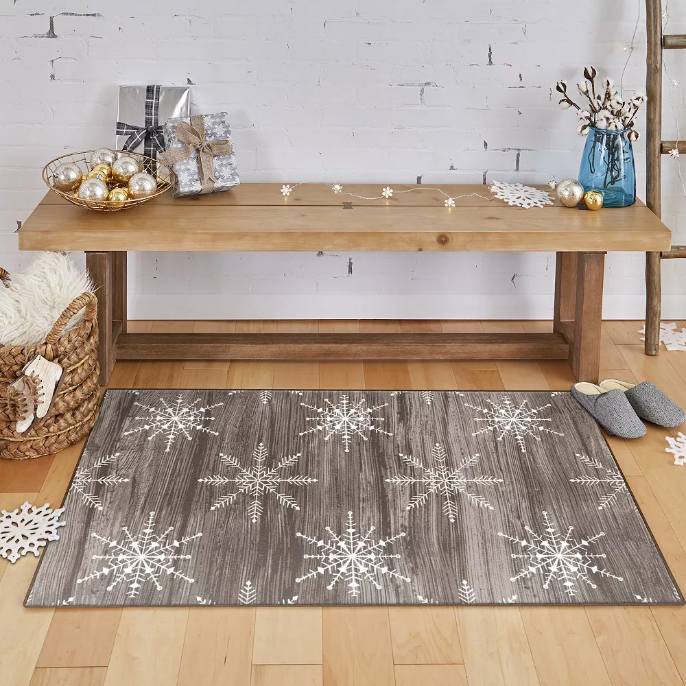 - Featuring light snowflakes on a rustic barnwood pattern, this cut pile rug is delightfully eye-catching
