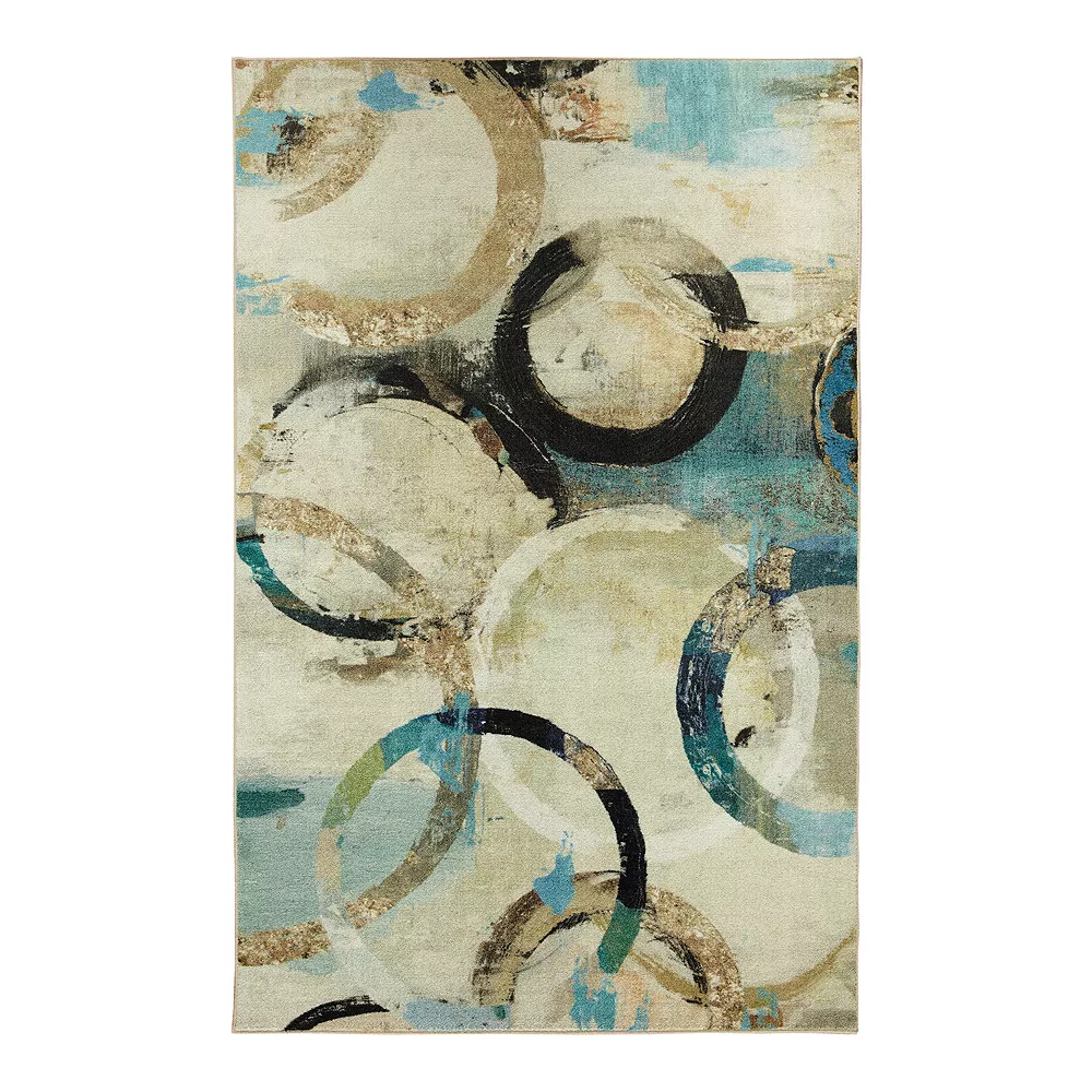 - Geometric outlines of circles in mineralized distressed shades of aqua blue, dark charcoal, ivory cream, taupe grey and neutral beige effortlessly create modern style anywhere with the contemporary design of Mohawk Homes Canvas Rings Area Rug. When it comes to color, the sky is no longer the limit with the infinite possibilities of Mohawk Homes revolutionary Prismatic Collection. Thoughtfully crafted in the U.S.A. in small batches utilizing Mohawk Homes exclusive Precision Dye Injected Printer, the Prismatic Collection is redefining printed rugs, literally one original design at a time. Each style in this collection features superior strength, stain resistance, and a cozy soft touch. Consciously created with EverStrand yarn, Mohawk Homes exclusive premium recycled polyester produced from post-consumer plastic water bottles, this collection offers environmentally friendly options that are as easy on the eyes as they are the world around us.