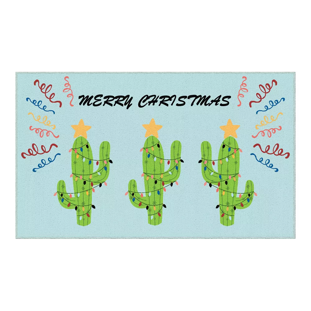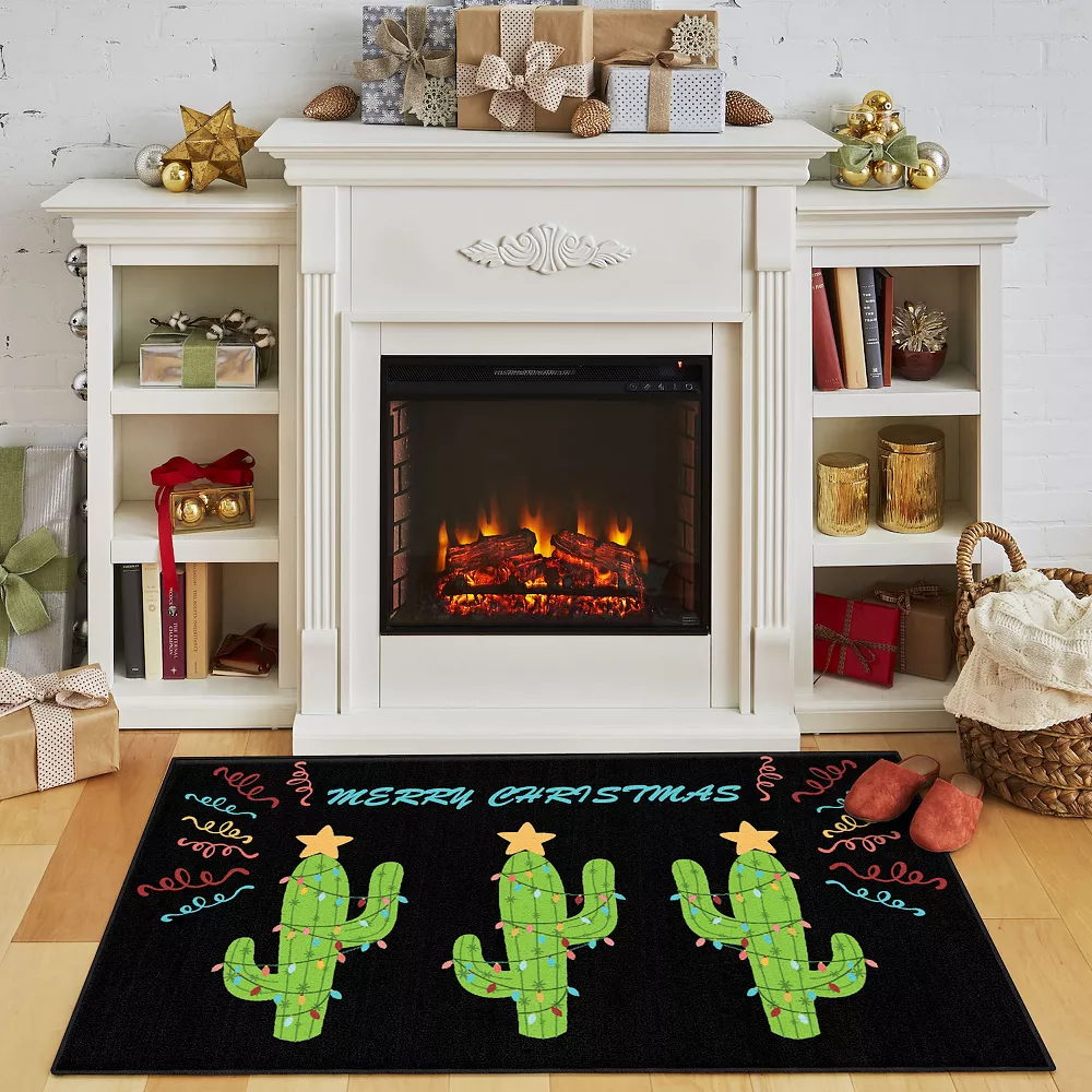 Revel in the festive celebration of Christmas cacti with this modern holiday rug. Made of cut pile polyester, the background is given a joyous feel with multi-colored accents in string lights and ribbons. Script typography offers a chic, elegant feel that makes this precision dye injected rug the perfect finishing touch in a living room.