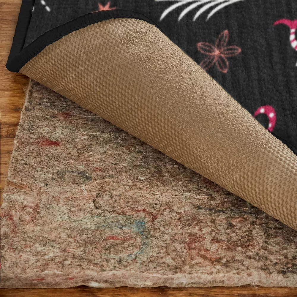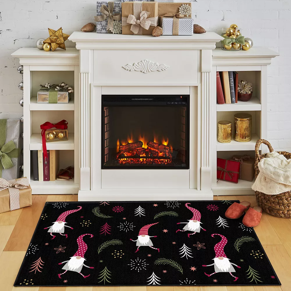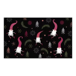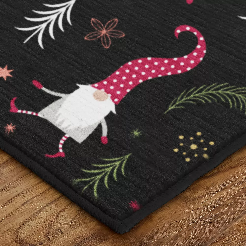 Featuring a perfect mixture of elves and gnomes, the merry dancing pattern from this Mohawk Home black rectangular rug is perfect for living and dining rooms!