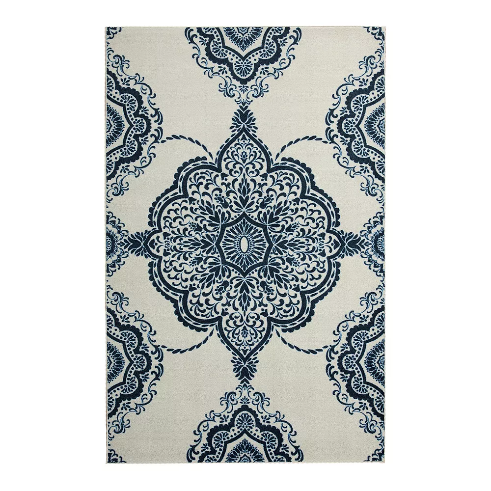 - An ornately detailed dark indigo blue and white globally inspired medallion motif is right at home with modern boho chic styles in the contemporary design of Mohawk Homes Edmond Area Rug