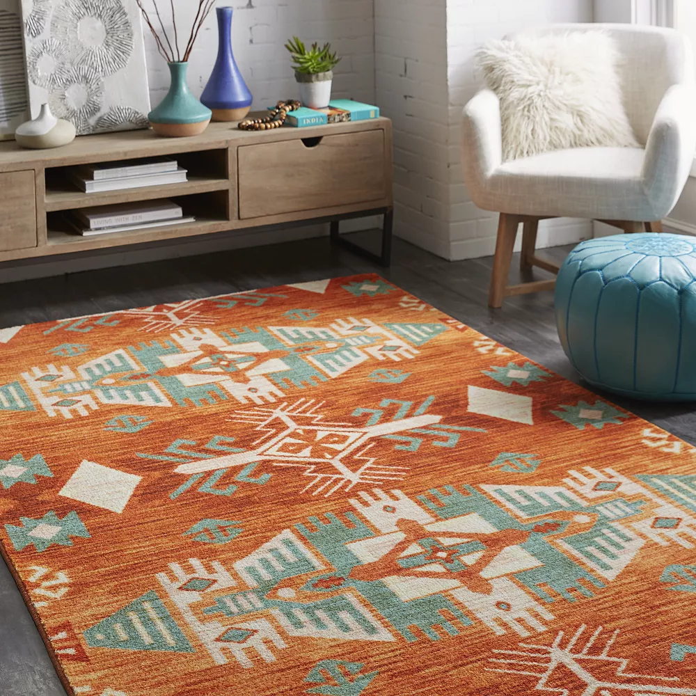 - Mohawk’s Eidenau Area Rug in Warm Sunset offers a modern take on timeless tribal inspired artistry, captured in an overdyed contemporary color palette