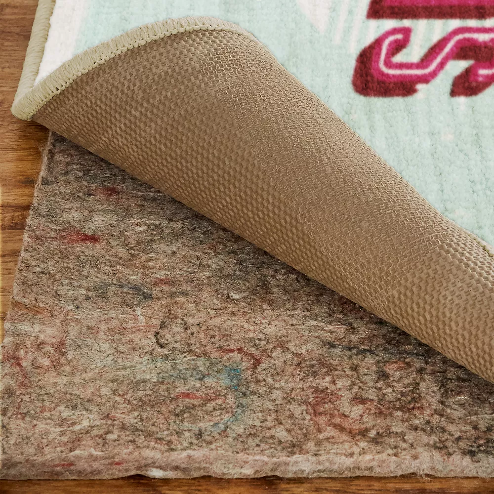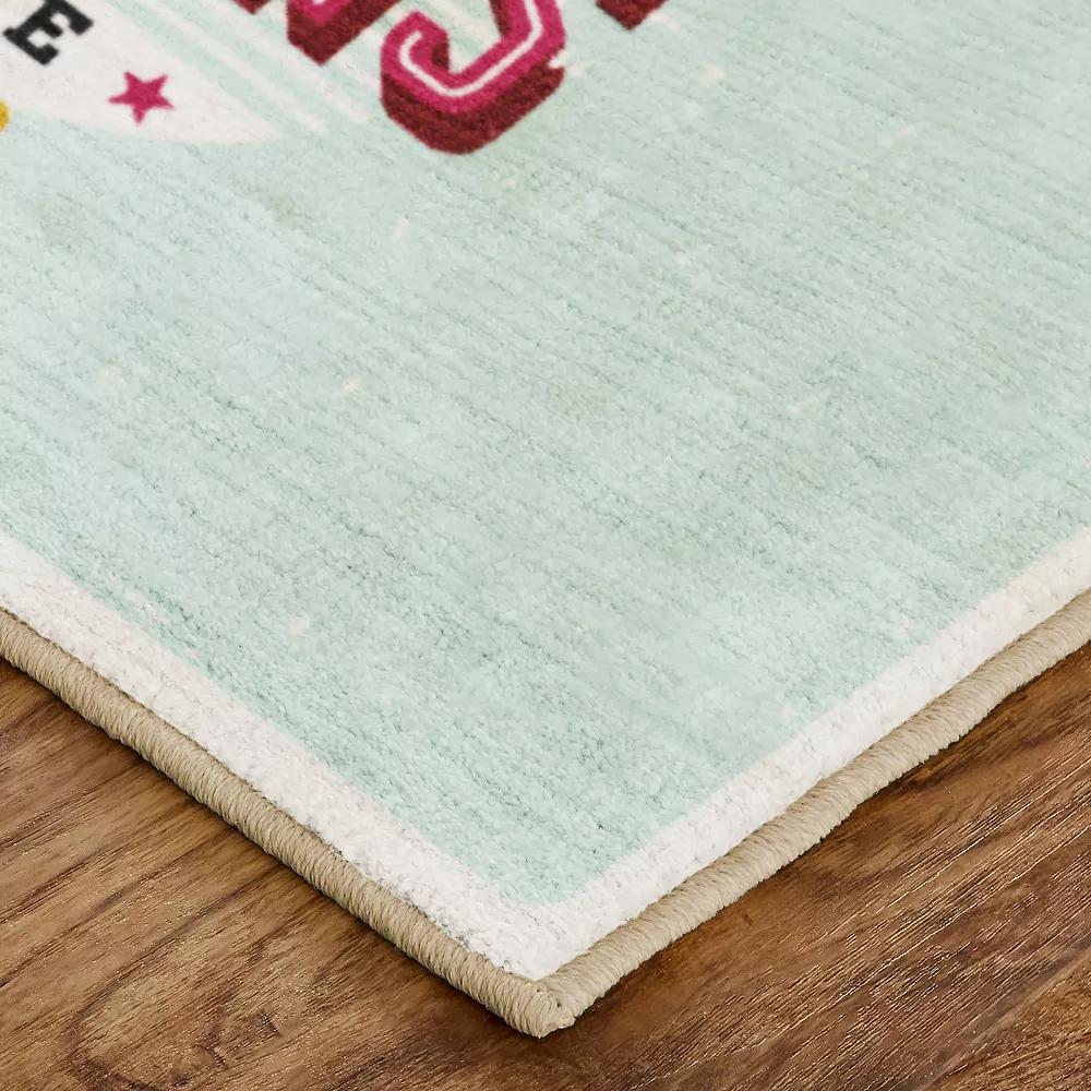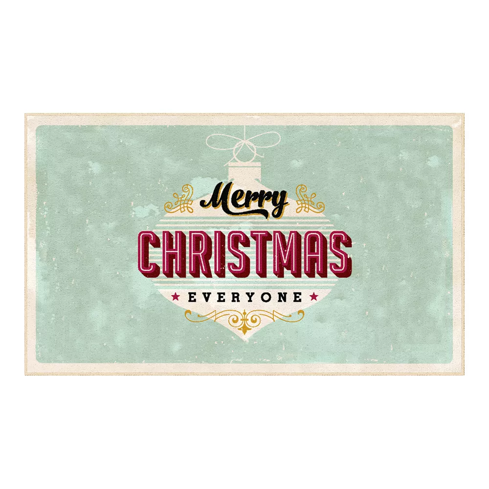 Featuring a vintage-inspired background, the distressed light blue hue gives this rectangular holiday rug a warm feel. Perfect for Christmas day, the cut pile polyester construction is perfect for opening presents on. Decorative text on the silhouette of an ornament stands out with vivacity.
