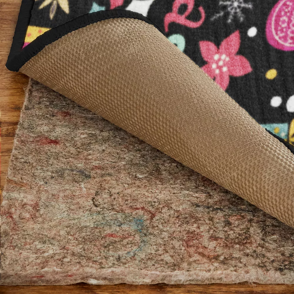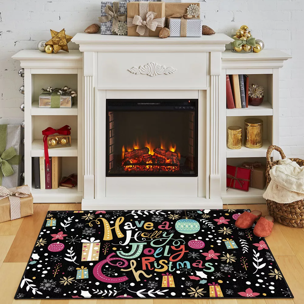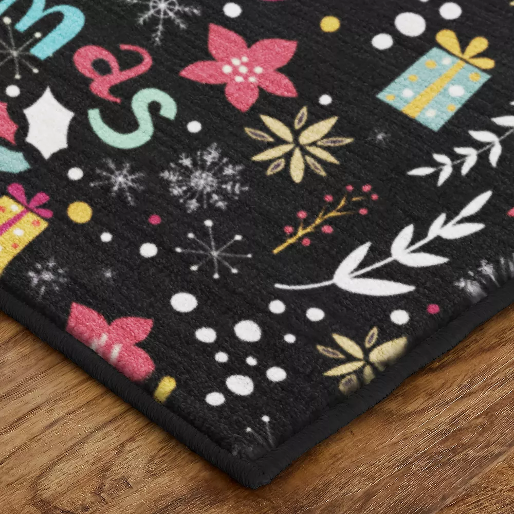 Far from simple, this modern holiday rug features bright illustrative imagery to complete a breathtakingly beautiful festivity set up. Jolly in a living room, the multi-colored pattern features iconic representations of the winter season, such as poinsettias and mistletoe, presents and ornaments, and snowflakes. Bright and colorful precision dye injected construction is streamlined with cut pile details and polyester material.