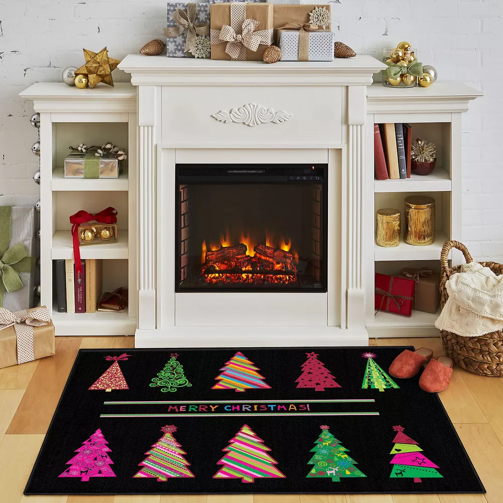 Dazzling color meets playful design in this multi-colored holiday rug. Featuring a simple black background, Christmas trees and text in a variety of hues pop on the cut pile design. Celebrate merry family gatherings on top of this rectangular polyester rug.