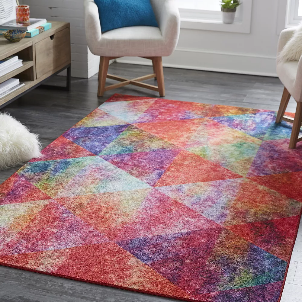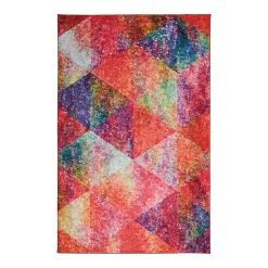 - Like gazing through the lenses of a kaleidoscope, psychedelic bursts of hot magenta pink, violet purple, fiery red, golden yellow, cloud white and lime green color meld together in the modern triangle motif of Mohawk’s contemporary Remick Area Rug