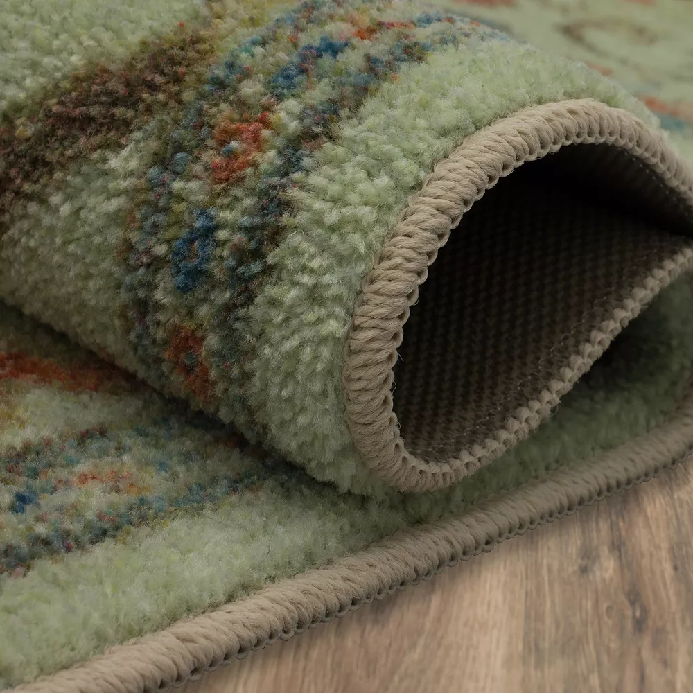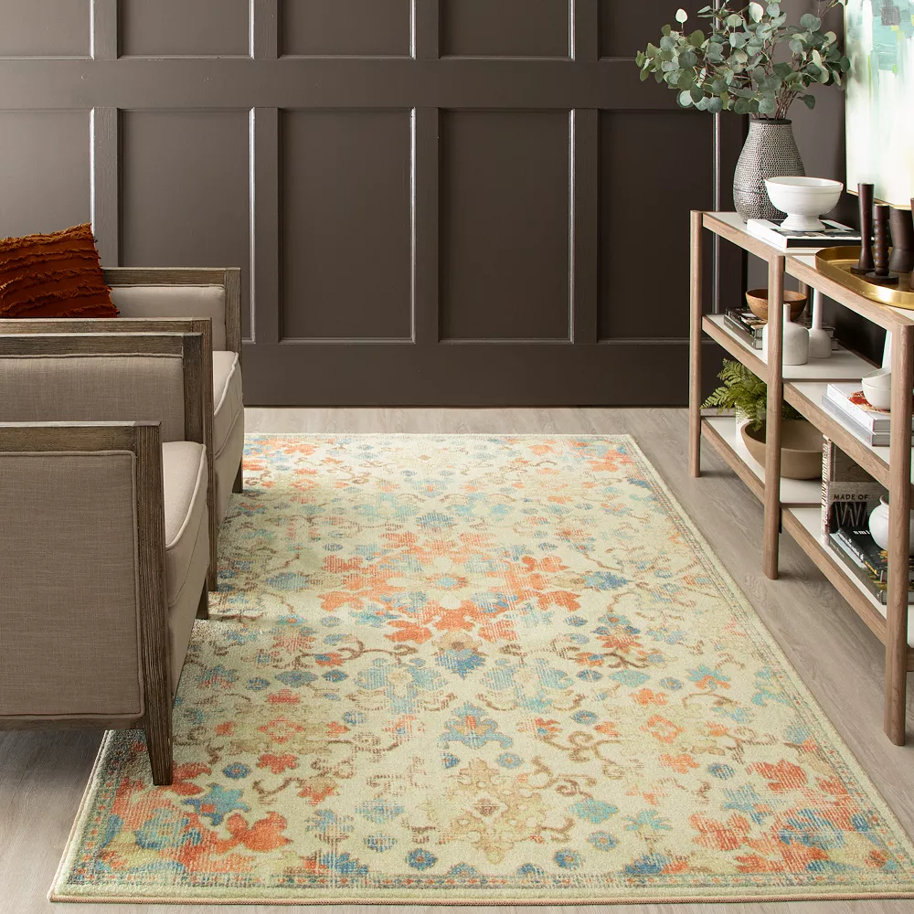 - Reminiscent of antique heirloom quality Persian designs, Mohawk Homes Sanborn area rug features a traditional Oriental motif cast in a vintage distressed color palette of neutral beige, faded denim blue, burnt orange, sage green and soft brown