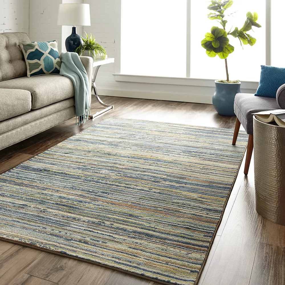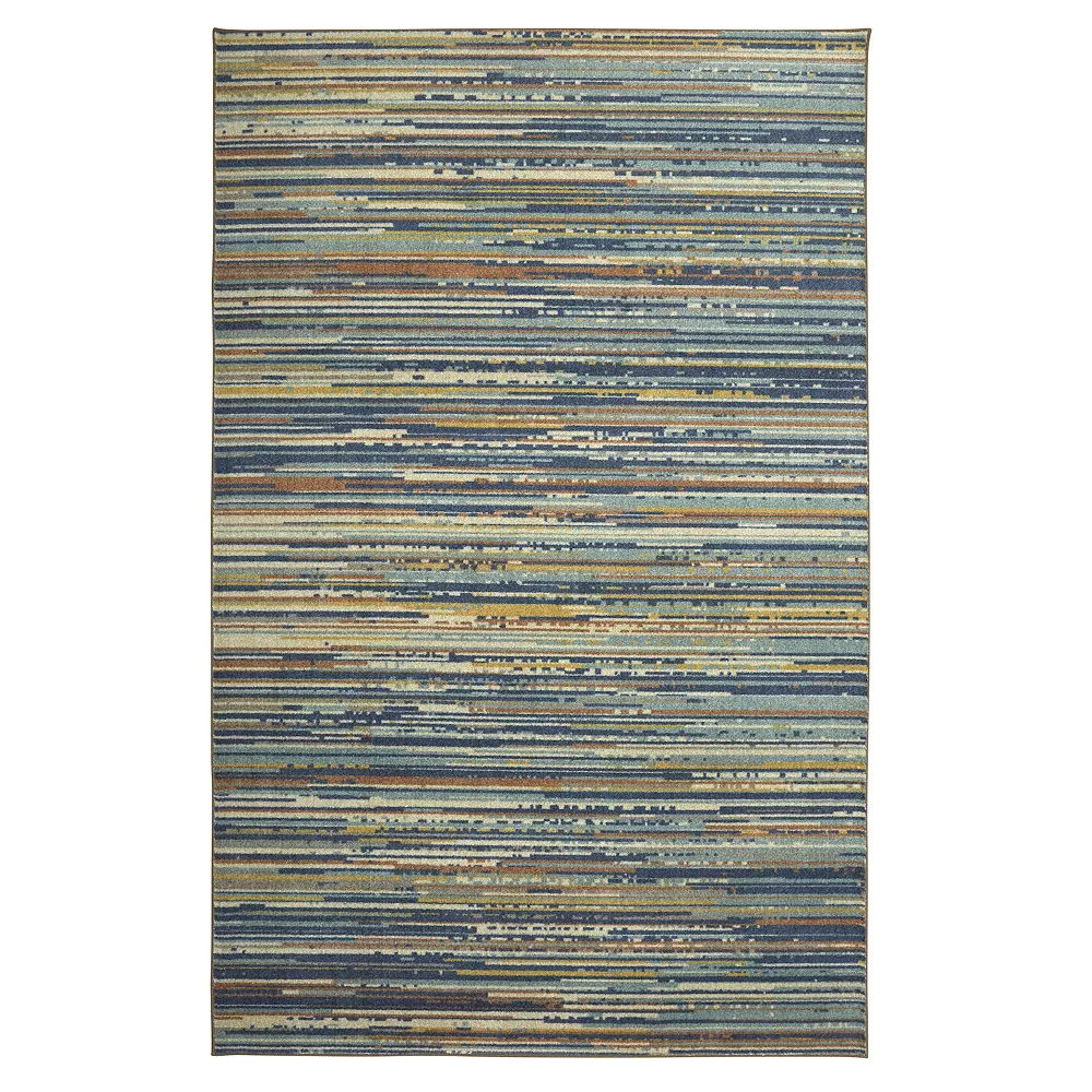 - Thin stripes steal inspiration from transitional space dyed designs in the modern style of Mohawk Homes dark blue, brown, green and neutral tan colored Santos Area Rug