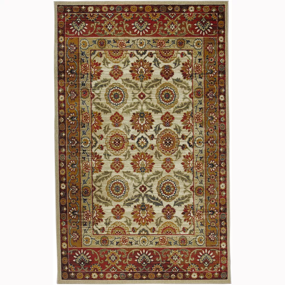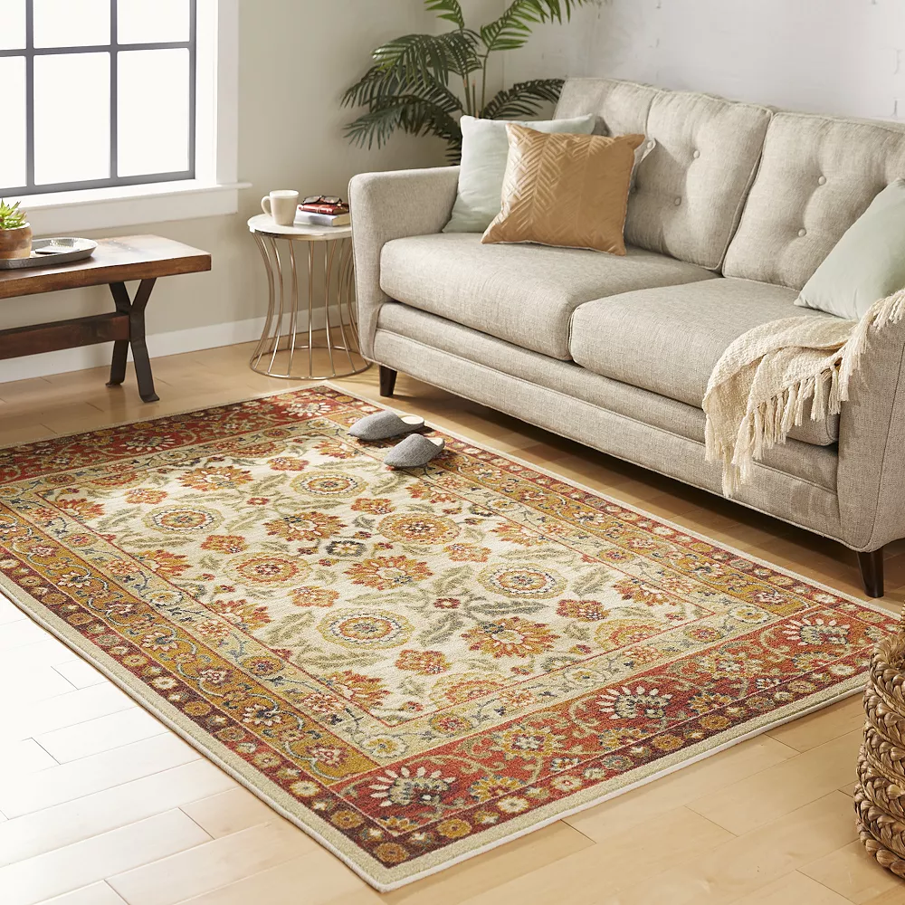 - Tones of gold and red stand out in this traditional floral area rug from Mohawk