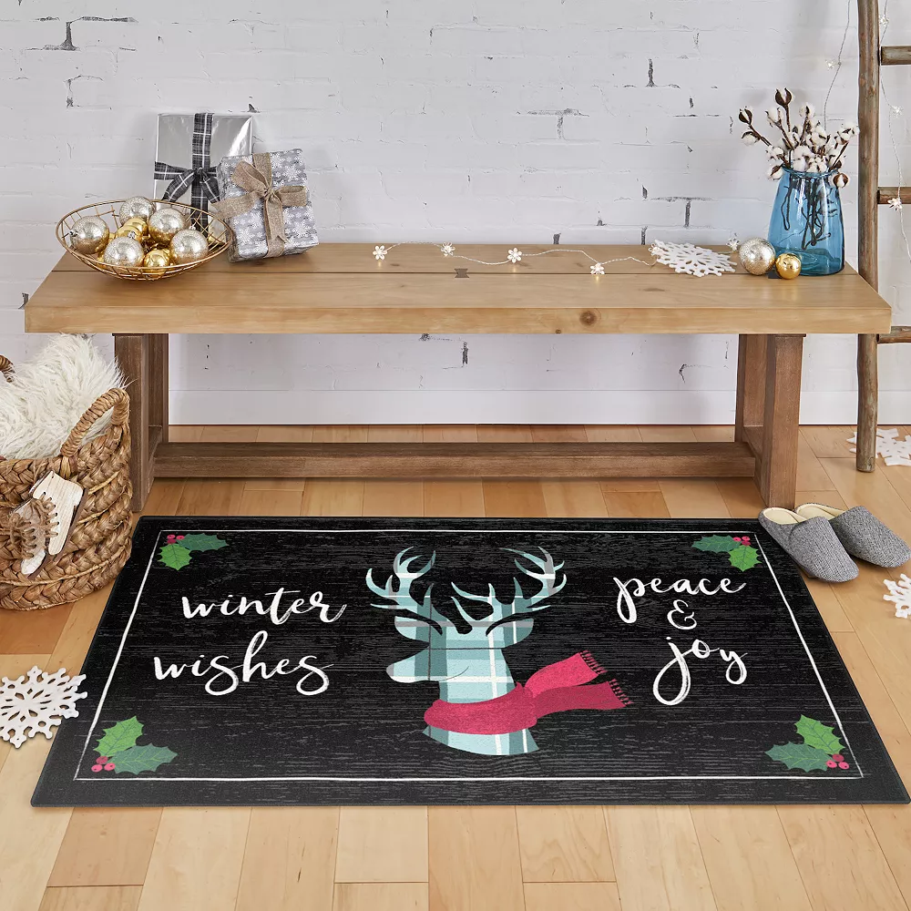 Elegant and full of cheer, this rectangular holiday rug features the silhouette of a reindeer in a bright plaid pattern!